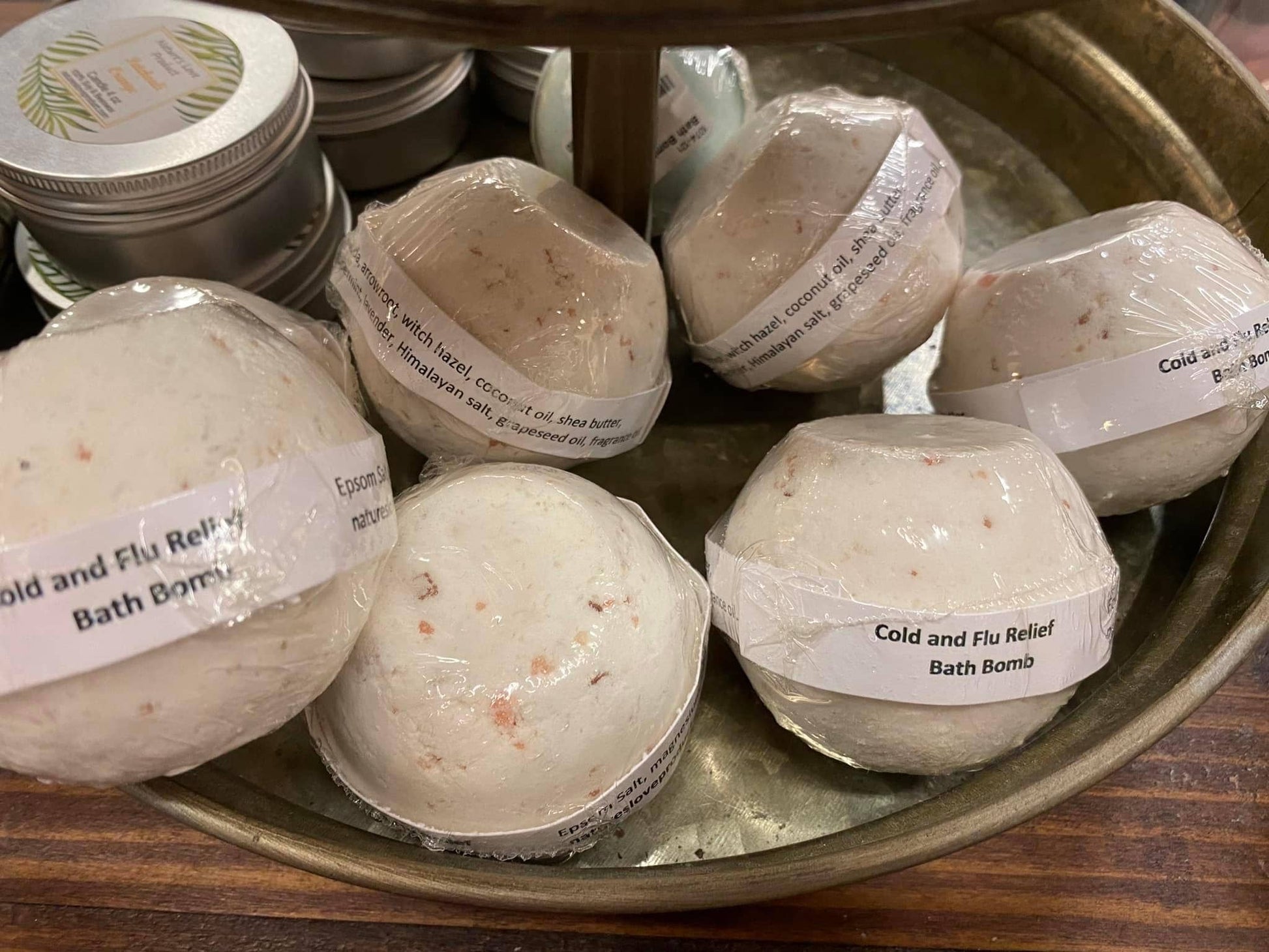 Why does the Cold and Flu Relief bath bomb work? The bath bombs are infused with eucalyptus, peppermint, lavender, magnesium, epsom salt, and Himalayan salt. It helps open up the air pathways and calm an achy body.
